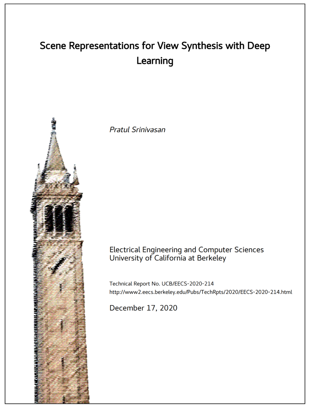 Srinivasan 的博士论文《Scene Representations for View Synthesis with Deep Learning》探讨了三维场景如何表征的问题,这样的表征可以有效地估计从标准的照片,然后可以用来从新的不可观测的视角合成同一场景的图像。