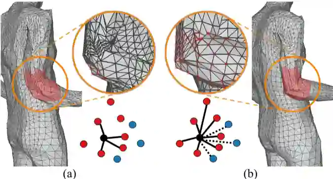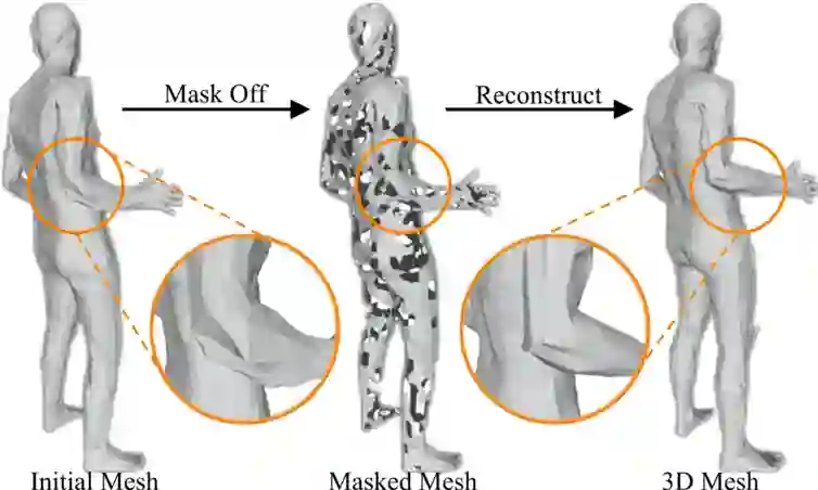 针对上述问题,本文提出了一个深层网格关系捕捉图卷积神经网络(Deep Mesh Relation Capturing Graph Convolution Network, DC-GNet)。首先,通过引入一个自适应邻接矩阵来同时学习人体节点间的正负相关的关系。通过学习人体内部节点间更细微的关系,模型从而习得捕捉复杂的人体局部结构的能力,如图1(b)所示。此外,提出了一个形状补全任务,即人为的在人体模型的表面上制造孔洞。而为了恢复缺失的信息,迫使网络模型从现有存在的邻接节点中推理必要的信息,如图2所示。户外环境下存在大量的遮挡情况,而大多数现有的室内数据集则缺少必要的遮挡样例。基于这样的数据集训练得到的模型通常会遭遇急剧的性能下降,而基于该形状补全任务训练的模型则能够从现存富有的室内数据库中习得人体遮挡的先验信息,从而很好的处理自然环境中的遮挡情况。该方法的流程示意图如图3所示。
