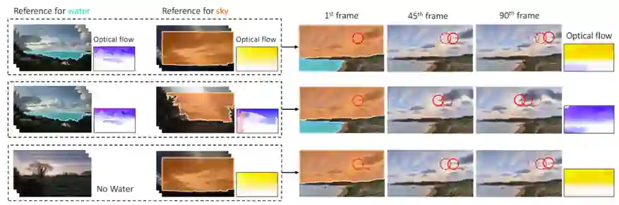 同时,由于我们的模型可以对不同语义区域的运动分别进行学习,这样可以使用不同的参考视频来对生成的视频进行控制。如图五,以水和天空为例,选取不同的参考可以使得生成的视频具有不同的动态效果。