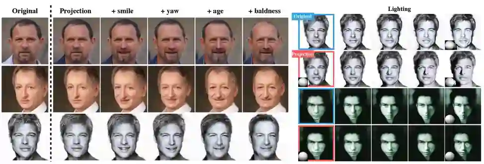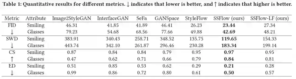 因为上述过程对一张人脸图像编辑需要提供该人脸的全部对应属性标签,对使用时不便利且不便于编辑无法提取到属性标签的图片,如艺术画人脸,且基于对我们模型编辑某种语义后的向量观察发现语义信息能被提取成方向向量,因此本文提出一种基于训练好的SSFlow,提取出每种语义属性对应的方向向量,使得编辑只需要让w向量沿着方向向量上移动即可实现。部分实验结果如图2所示。如表1所示我们在FFHQ数据集上也表现出更好的效果。