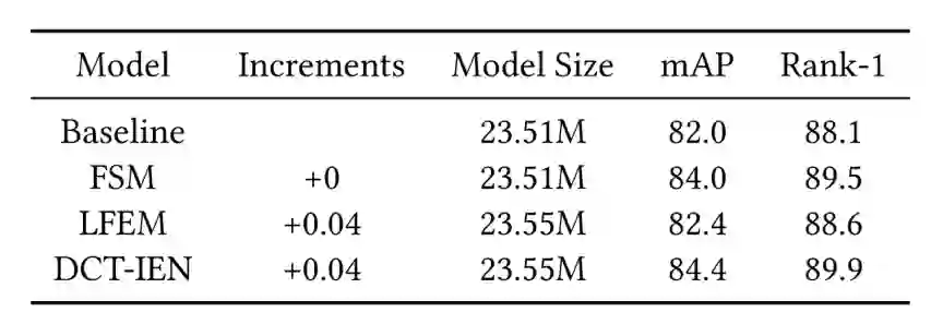 在上述理论基础上,本文方法为视频行人重识别任务设计了一种基于离散余弦变换的信息增强网络(DCT-IEN)。整个网络由两个分支组成:频域选择分支(FSM)和最低频分量分支(LFEM),分别学习每帧图像中的判别性信息和序列级的共享信息。频率选择分支将backbone提取出的特征图进行DCT变换,在频谱上进行划分,并利用二维attention map对判别性信息进行增强。最低频分量分支使用DCT最低频分量表示共享信息,同时利用正则化项拉近不同帧之间的特征图距离,实现共享信息的增强。通过同时利用两种信息,该网络实现了更完整的视频表征。