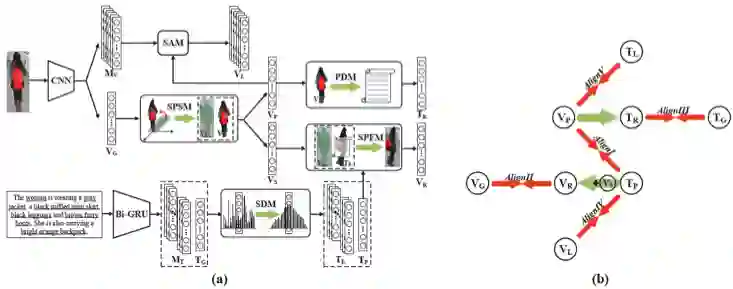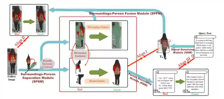 在大多数实际应用场景中,文本描述的提供者并不知道目标行人所处的场景与环境,因而文本中基本只包含行人信息。基于这一观点,论文中提出了一种深度环境行人分离学习模型(DSSL)进行高效精准的行人特征提取与匹配。如图1、 2所示,环境行人分离与融合机制(SPSM+SPFM)起到了关键性的作用,在信息正交约束下,通过行人特征的分离与跨模态融合重构匹配,采用五种不同的跨模态多粒度信息对齐方式,在训练过程中相互制约与引导,从而实现精准的环境行人剥离与匹配,极大提升了模型精度。