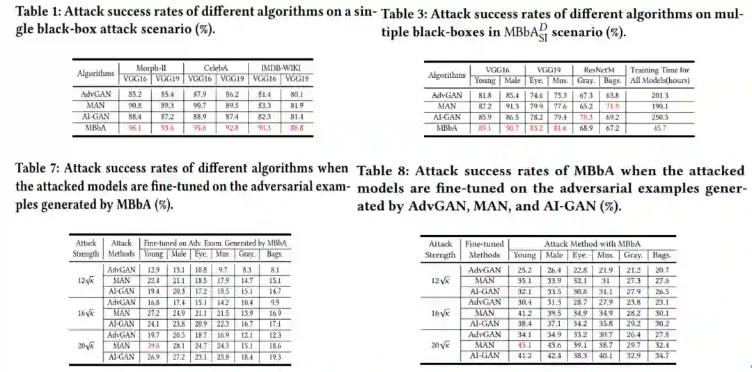 表1,3给出MBbA在单个黑盒系统和多黑盒系统上攻击结果,从图中我们可以看到,MBbA在所有比较算法中,大多数攻击性能是最好的,且花费的时间最少。同时我们将MBbA生成对抗样本用于训练目标模型的学习,这些学习后的模型防御性能提升很多,当这些算法再次攻击这些模型时候,攻击成功率大大下降,但依旧MBbA攻击成功率在大多数是最好的。其它实验结果可以具体参考原文。