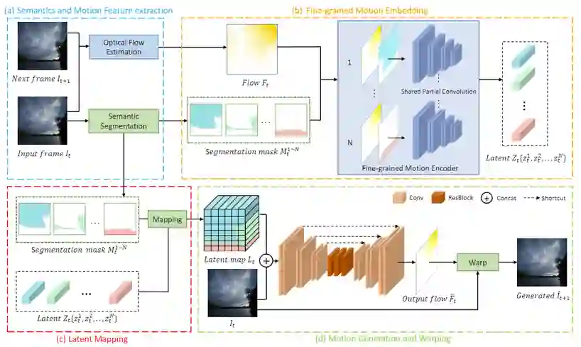 如图一中AL的结果,显式地使用光流作为运动信息的表达使得运动和内容学习可以分开进行。然而由于光流本身缺乏语义性,很难直接从光流学到与图片的对应关系。为解决上述问题,本文使用语义信息为引导,将运动信息嵌入到不同的语义空间,得到更加细粒度的运动表示,从而生成具有更加真实动态效果的视频。如图二所示,模型的编码器使用部分卷积 (partial convolution) 来根据不同的语义分割图对整张光流进行嵌入学习,得到细粒度表达。再根据输入图片的语义分割图重新排列这种表达。模型的解码器根据以上信息生成下一帧的光流预测,从而循环地生成整段视频。