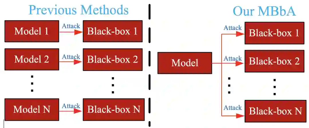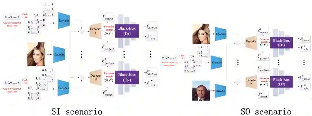 深度学习模型极易受到攻击,因此当前很多研究设计攻击算法去攻击这些目标模型,从而测试它们的鲁棒性能,进而人们根据这些反馈结果来提高这些模型的防御能力。当前对抗攻击主要分为白盒攻击和黑盒攻击,白盒攻击算法较为成熟,而黑盒攻击依旧充满挑战。如图1所示,当前所有黑盒攻击算法都是针对单个目标,即一个算法对应一个攻击目标,当有多个攻击目标时候,需要训练多个攻击算法系统,这需要大量计算开销和时间开销。而实际应用中,有许多黑盒系统是有相同的输入,即训练集相同而输出不同;也有些黑盒系统输入是同类别数据集,而输出是相同的分布。我们可以看出这些模型有相似的地方,是否存在这样攻击算法,利用这些共性对多个具有上述相似功能的目标系统发动攻击。