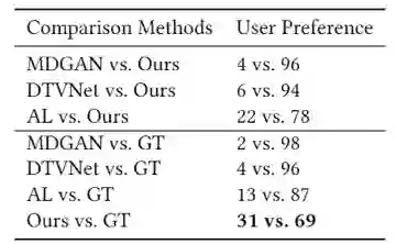 同时我们也基于Flickr收集了一个大规模的延时视频数据集 Time-lapse-D。该数据集是至今为止最大的、具有最多种类的延时视频数据集。在一系列客观和主观评测指标上,我们的模型都取得了至今为止最好的效果:图三、四。图三中我们同时选取图片和视频的评测用来衡量生成视频的帧和运动。图四中我们设计了一个用户评价来测量人类视觉上的主观感受。