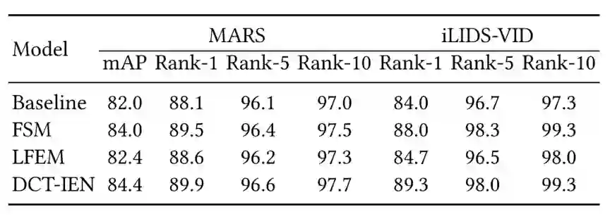 表1给出了本文方法在MARS数据集上的消融实验,验证了判别信息和共享信息对视频表征均具有重要意义的猜想。表2给出了本文网络结构的模型参数量,可以发现相比于基线模型,本文方法仅仅增加了0.04M的参数,实现了效率和性能的良好平衡。如图3所示,将DCT-IEN与前沿方法在MARS和iLIDS-VID数据集上进行比较,结果表明本文方法均达到SOTA性能。