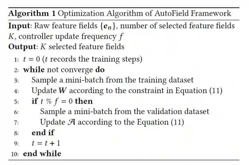 由于深度推荐模型以及控制器网络相互依赖,在训练集上同时训练深度推荐模型的参数以及控制器网络的参数将导致过拟合问题。因此,本工作采用类似DARTS的优化方法,在验证集上更新控制器网络,在训练集上更新深度推荐模型。具体的优化算法如上图。