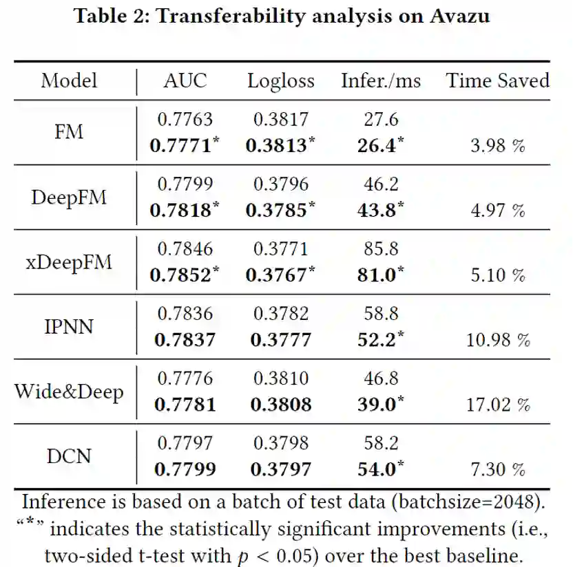 在Avazu上进行迁移实验。基于Embedding + MLP的深度推荐模型搜索得到的特征选择结果迁移到其他模型上,也可以帮助其他模型增强推荐效果。同时,使用更少的特征字段也帮助缩短模型的推断时间。