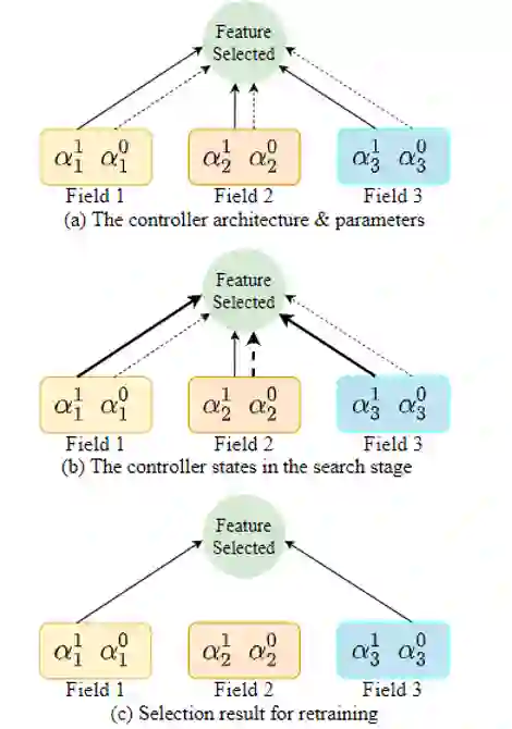 如图中(a)所示,我们首先初始化控制器网络的参数,将每个字段的两个参数设置均为0.5 (图中线的粗细表示对应参数的大小,实线表示被选中,虚线表示被放弃)。如图(b)所示,随着搜索阶段的进行,更有用的特征字段对应的