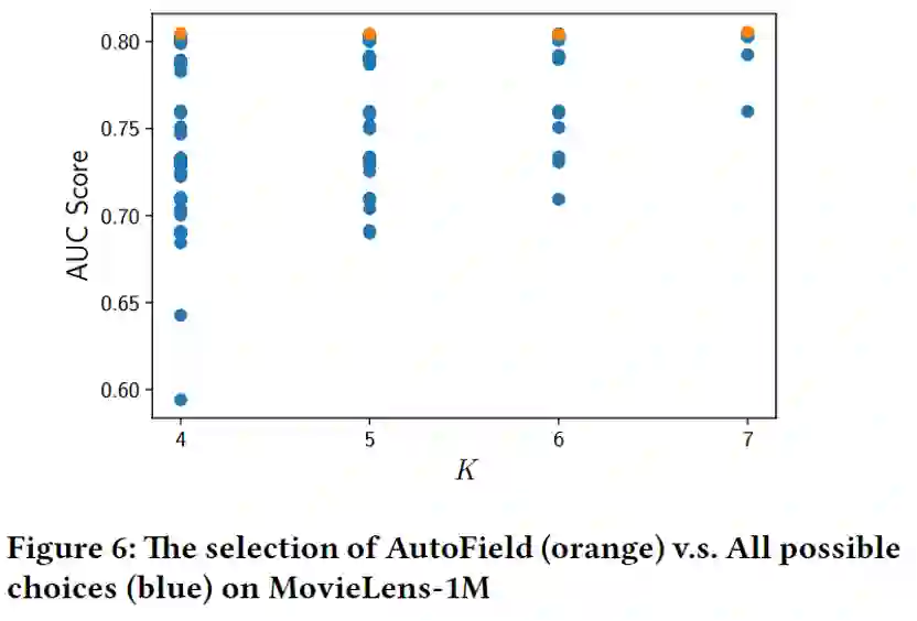 我们在Movielens1M上进行实验,发现AutoField对任意的K,都可以取到最优的特征选择结果。图中蓝色点表示遍历的特征组合的效果,橙色点为AutoField选择的特征组合取得的效果。