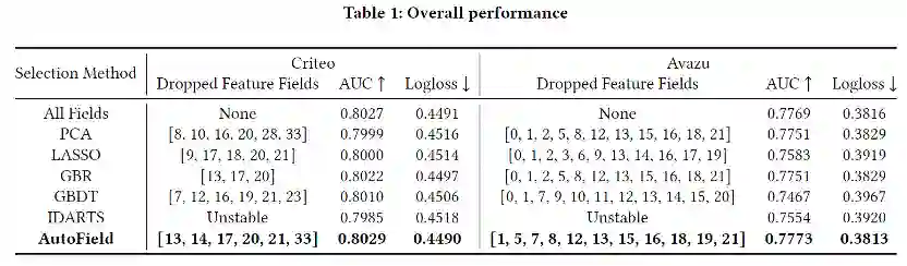 在两个数据集上,在使用特征字段数量一样或者更少的情况下,相比其他所有特征选择的方法,AutoFIeld均取得了最佳的效果,且好于使用全部特征字段。在Avazu上,只使用一半的特征字段可以取得更好的效果。
