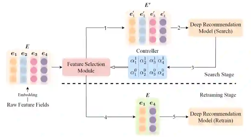 特征质量对推荐系统的效果具有显著的影响,因此特征选择对设计推荐系统来说至关重要。现存的推荐模型聚焦于设计复杂的神经网络结构,但忽视了特征选择过程的设计。这些模型只是简单地将所有可以使用的特征字段一起输入到模型中,或者利用专家知识人为地选出重要的特征字段。前者容易引入对推荐效果无效甚至有害的特征字段,导致额外的模型参数,增加推断时间;而后者需要人类专家的指导以及大量的人力,因此在实现上存在一定困难。