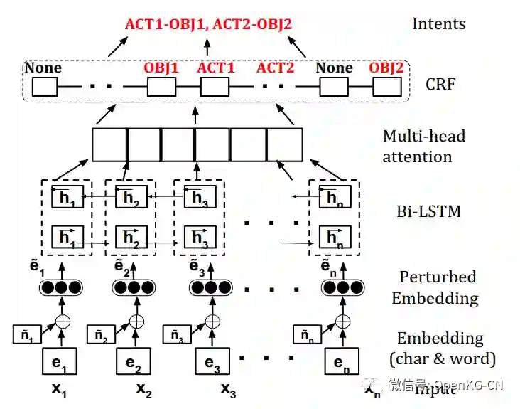 如图1所示,本文提出的OPINE框架主要包括:对抗训练,Bi-LSTM语义编码,Multi-head attention机制,带约束的CRF,生成意图等。OPINE框架相对简洁,且在各阶段都进行了精细处理。具体如下,