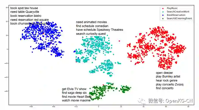 本文提出的抽取式开放意图识别框架OPINE在图4中得到充分证明,基于这种思路可学到语言的底层信息,模型具备很强的迁移性。具体而言,OPINE + classifier指基于Stack Exchange data训练的模型获取编码,给定SNIPS和ATIS的意图类别数,OPINE + classifier基于层次聚类获得最终预测标签(完全的domain迁移),在两个数据集下取得了与封闭意图识别SOTA相当的结果。具体聚类效果图如图5所示。
