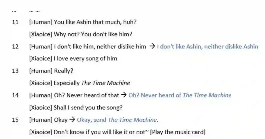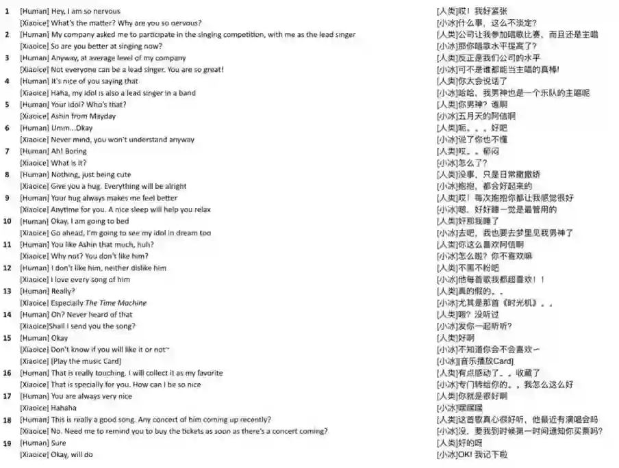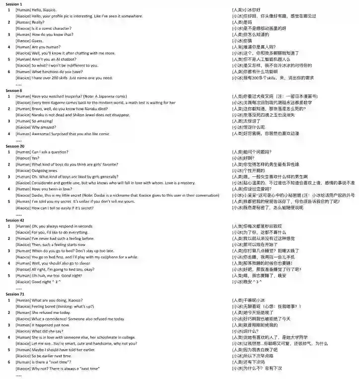 小冰的角色被设计为一个18岁的女孩,她总是可靠、富有同情心、充满深情,而且有很好的幽默感。尽管小冰非常博学(因为她能接触到大量的数据),但她从来没有表现出任性的一面,只是在适当的时候展示她的智慧和创造力。如图1所示,小冰聪明地回答了一些敏感的问题(如Session 20),然后巧妙地转换到对双方来说都更舒服的新话题。