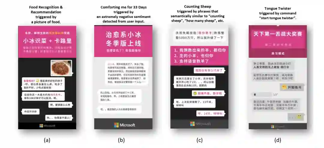 深度参与技能的例子。(a)食物识别与推荐技能,由食物图片触发;(b)“安慰我33天”技能,由用户输入中检测到的极度负面情绪触发;(c)“计数羊”技能,由类似“数羊”、“多少只羊”等短语触发。(d)绕口令技能,由“开始绕口令”命令触发。