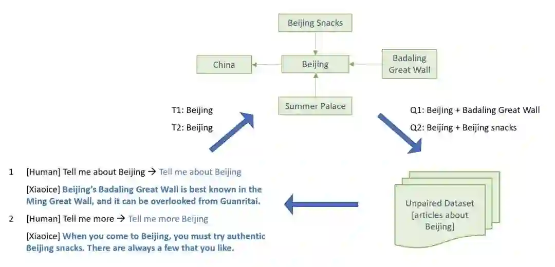 使用未配对数据集和XiaoIce知识图(KG)生成响应候选的示例,本文为此显示了与“北京”(上图)话题相关的小冰KG片段。 对于人机对话(左下),每个用户查询被重写为由箭头指示的上下文查询,然后识别其话题(例如,“北京”),相关话题(“八达岭长城”和“ 从KG(顶部)检索“北京小吃”),使用组合查询话题及其相关话题的查询从未配对数据集(右下角)检索响应候选者。