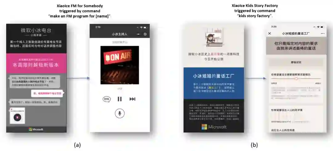 上图中的(a)展示了一位用户使用小冰为她的母亲制作了一个FM节目,为即将到来的春节做准备。(b)展示了小冰可以根据用户配置自动创建一个故事,例如,这个故事是用于教育还是娱乐,主要人物的姓名、性别和性格等。