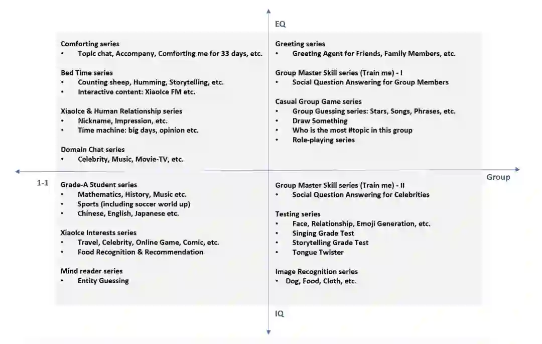 IQ 能力包括知识和记忆建模、图像和自然语言理解、推理、生成和预测。这些都是发展对话技巧的基础,它们对于社交聊天机器人来说是必不可少的,可以满足用户的特定需求,帮助用户完成特定的任务。