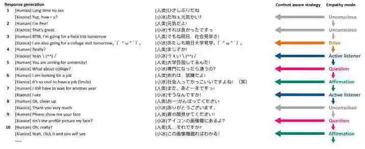 图2:用户与小冰的聊天记录,使用日语(中间),英语翻译(左)。移情模型提供了一种上下文感知策略,可以在需要的时候驱动对话(右)。例如,小冰决定在第3轮对话停顿时将对话“驱动”到一个新主题,并在第4轮和第7轮对话中,当用户自己也参与到新主题时积极倾听。