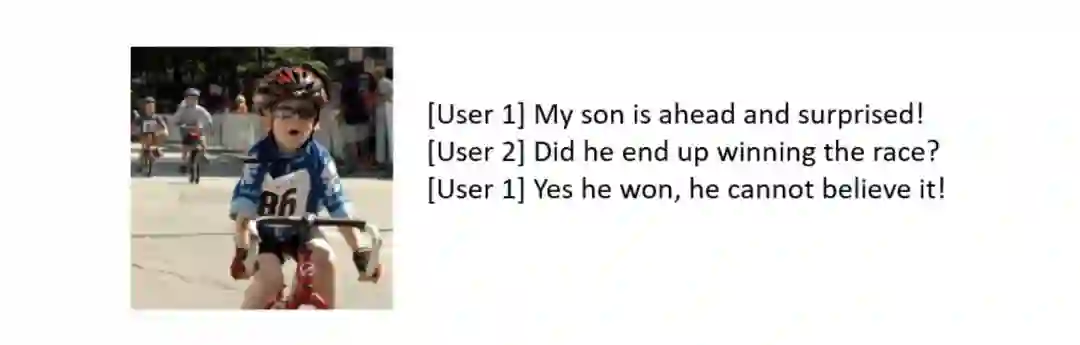 上图示出了围绕共享图像的社交聊天。 可以看到,对话不仅基于可见对象(例如,男孩,自行车),而且还基于图像中隐含的事件,动作或甚至情绪(例如,比赛,获胜)。