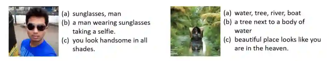 (a)图像标记;(b)图像描述;(c)图像评论。