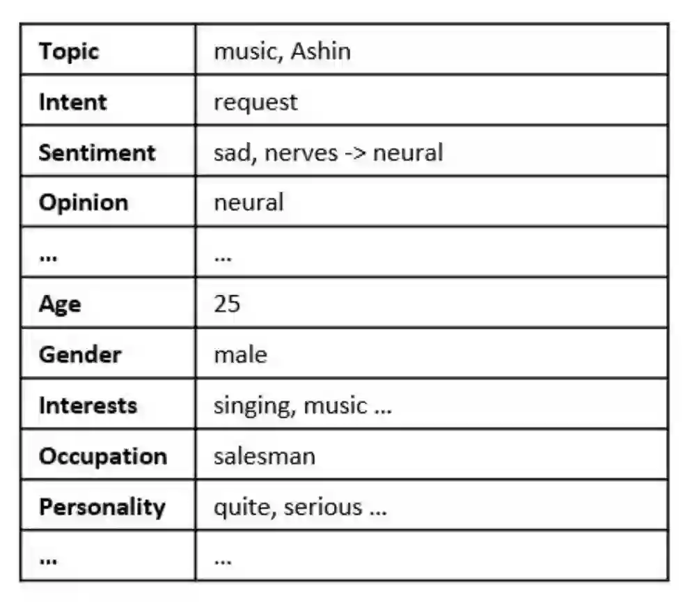 该组件基于Qc和C生成查询移情向量eQ。eQ由表示用户意图、情绪,话题、观点和用户角色的键值对的列表组成,如下图所示: