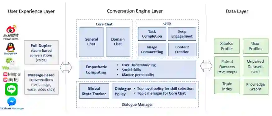 用户体验层:该层将小冰连接到流行的聊天平台(如微信、QQ),并以两种模式与用户交流:全双工模式和轮流对话模式。该层还包括一组用于处理用户输入和小冰响应的组件,如语音识别和合成、图像理解和文本规范化。