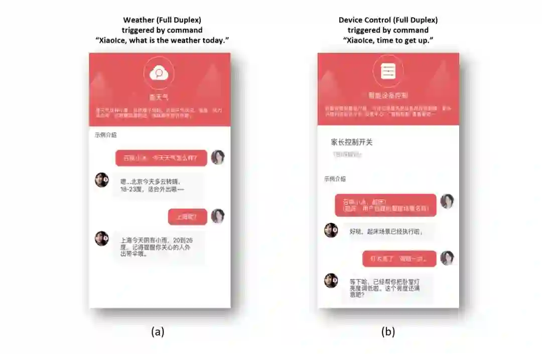 任务完成技能的例子。(a)天气技能,由“小冰,今天天气如何”的命令触发;(b)设备控制(全双工)技能,由指令“小冰,该起床了”触发。