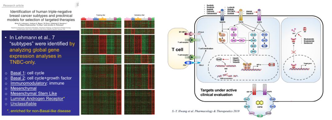 虽然众多靶向新药在TNBC的研究中遭遇滑铁卢,但近两年来,以PARP抑制剂和免疫检查点抑制剂为代表的靶向治疗依然取得了突破性进展。基于OlympiAD、EMBRACA研究结果,PARP抑制剂对比传统化疗显著延长PFS且毒副反应更低,2018年Olaparib、Talazoparib相继获FDA批准用于胚系BRCA1/2突变、HER2阴性的转移性乳腺癌。免疫治疗在众多实体肿瘤治疗中取得令人欣喜的成果,为TNBC带来了曙光。IMpassion130是一项随机、双盲、安慰剂对照临床研究,对比了Atezolizumab(PD-L1单抗)联合白蛋白紫杉醇与安慰剂联合白蛋白紫杉醇,一线治疗局部晚期或转移性TNBC的疗效和安全性。本次ASCO会议公布了第二次中期分析OS数据,在PD-L1阳性的晚期TNBC患者中,Atezolizumab联合白蛋白紫杉醇治疗组与对照组相比,总生存提高7个月。2019年,Atezolizumab成为首个获批上市的PD-L1抑制剂,免疫治疗被写入临床指南。在通往TNBC “分类治疗”的道路上筛选(细化分子分型)、甄别(寻找疗效预测指标)与开发(新靶点与新药物)缺一不可。