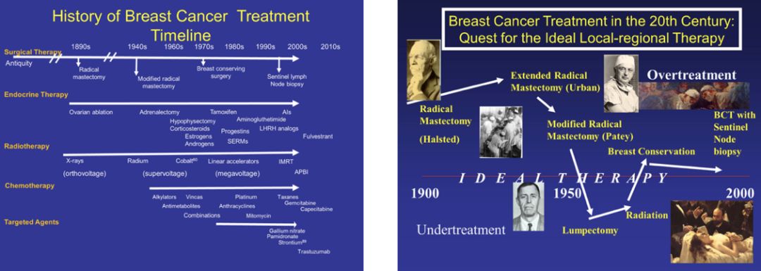 继Imhotep的病例记录被破解后,乳腺癌再次出现于公元前500年,大流士之妻、波斯皇后阿托莎发现乳房有一枚流血的肿块,由她的希腊奴隶执行了最原始的乳房切除术。中世纪的外科医生对乳腺癌虽略知皮毛,但深受“黑胆汁理论”影响,亦碍于术后感染的高死亡率,仅在穷途末路时才会切除肿瘤。随着麻醉与消毒技术的突破,1869年苏格兰医生Hoseph Lister带领一众外科医生再次普及肿瘤切除术,吹响了近现代乳腺癌治疗的第一声冲锋号。直至1894年,时任约翰霍普金斯医院外科主任的William Halsted提出了乳腺癌根治术,将乳腺癌切除的理念发挥到极致。正如其名,radical来源于拉丁文,意为根或极致,即将全部乳腺、相当范围的乳腺皮肤和周围组织,以及胸大、小肌和腋窝淋巴结全部清除。这一术式基于Halsted对乳腺癌扩散途径的理论:乳腺癌扩散遵循时间与解剖学规律,肿瘤细胞先发生局部浸润后、突破淋巴屏障向远处转移。该术式的推广大大降低了乳腺癌局部复发率,成为乳腺癌外科治疗领域最具划时代意义的里程碑。在Hasteld理论的影响下,扩大根治术应运而生,20世纪50年代发展至鼎盛。然而患者的生存期如常、并发症严重,均与扩大根治术所希冀的初衷背道而驰。20世纪50年代保留胸大肌和胸小肌的改良根治术I式和切除胸小肌、保留胸大肌的改良根治术Ⅱ式相继被提出,并称为乳腺癌改良根治术,与Halsted根治术的10年生存率相似。乳腺癌改良根治术凭借其功能及美容等方面的优越性,逐渐成为七十年代后期替代根治术的标准术式。