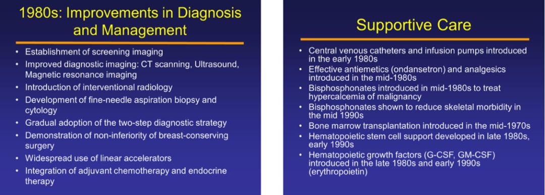 七十年代末至八十年代初,NSABP-B11等研究表明含蒽环类的CAF、AC方案优于CMF方案,肯定了蒽环类药物在辅助化疗中的作用。1988年,NSABP-B18试验入组了可手术的乳腺癌患者,比较AC*4化疗后手术与手术后AC*4辅助化疗对预后的影响,结果显示两组的DFS与OS无显著差别,新辅助化疗向优化个体化治疗策略迈进一步。化疗的普及使得相应支持治疗随之发展。八十年代中期,昂丹司琼等止吐药与止痛药用于肿瘤治疗;八十年代末期,造血干细胞、G/GM-CSF等支持治疗相继应用,有效减轻了患者的痛苦。
