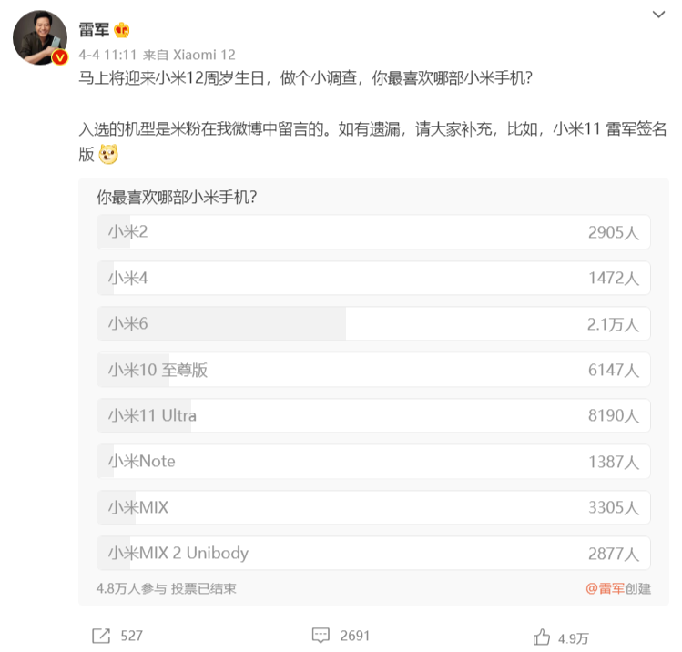 【雷军票选最受欢迎小米手机,小米6排名第一】4日,@雷军在微博发起一项投票:“马上将迎来小米12周岁生日,做个小调查,你最喜欢哪部小米手机?”经过近一天的投票,小米6以2.1万票遥遥领先。