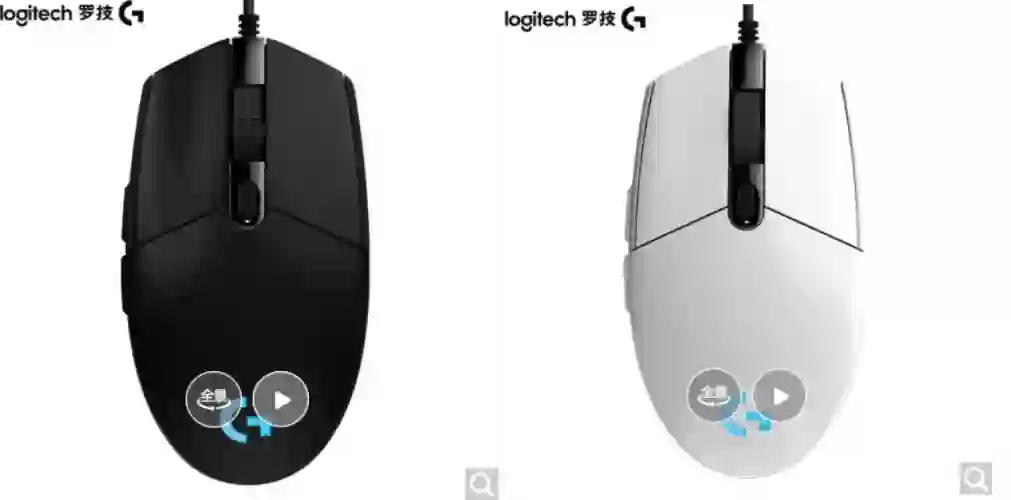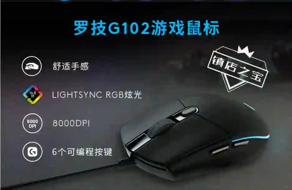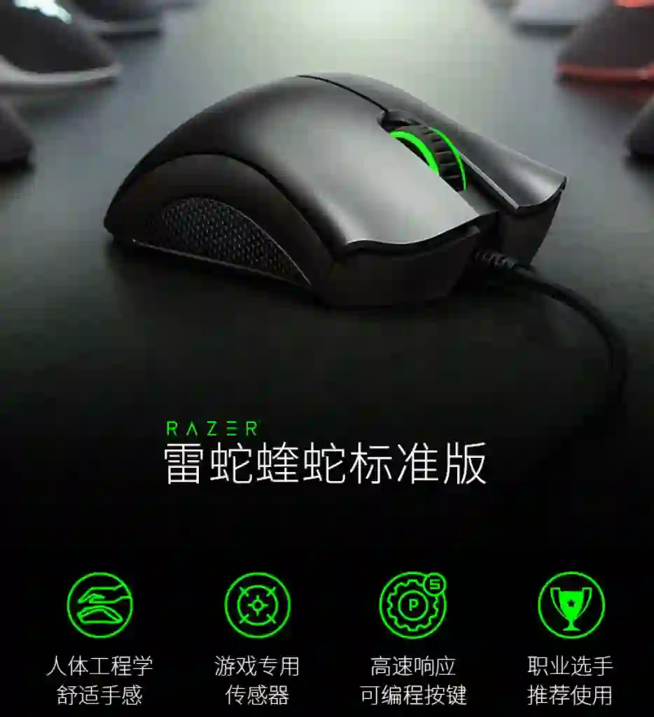 推荐理由:只有雷蛇在这个价格范围内了,传感器没有标注,从网上查询了下应该是 3325 雷蛇定制版,灯光只有绿色,但是可以调节模式,推荐这个是因为这个鼠标比 G102大一点,如果不想用小鼠的,就选它吧,价格也是比较便宜的。