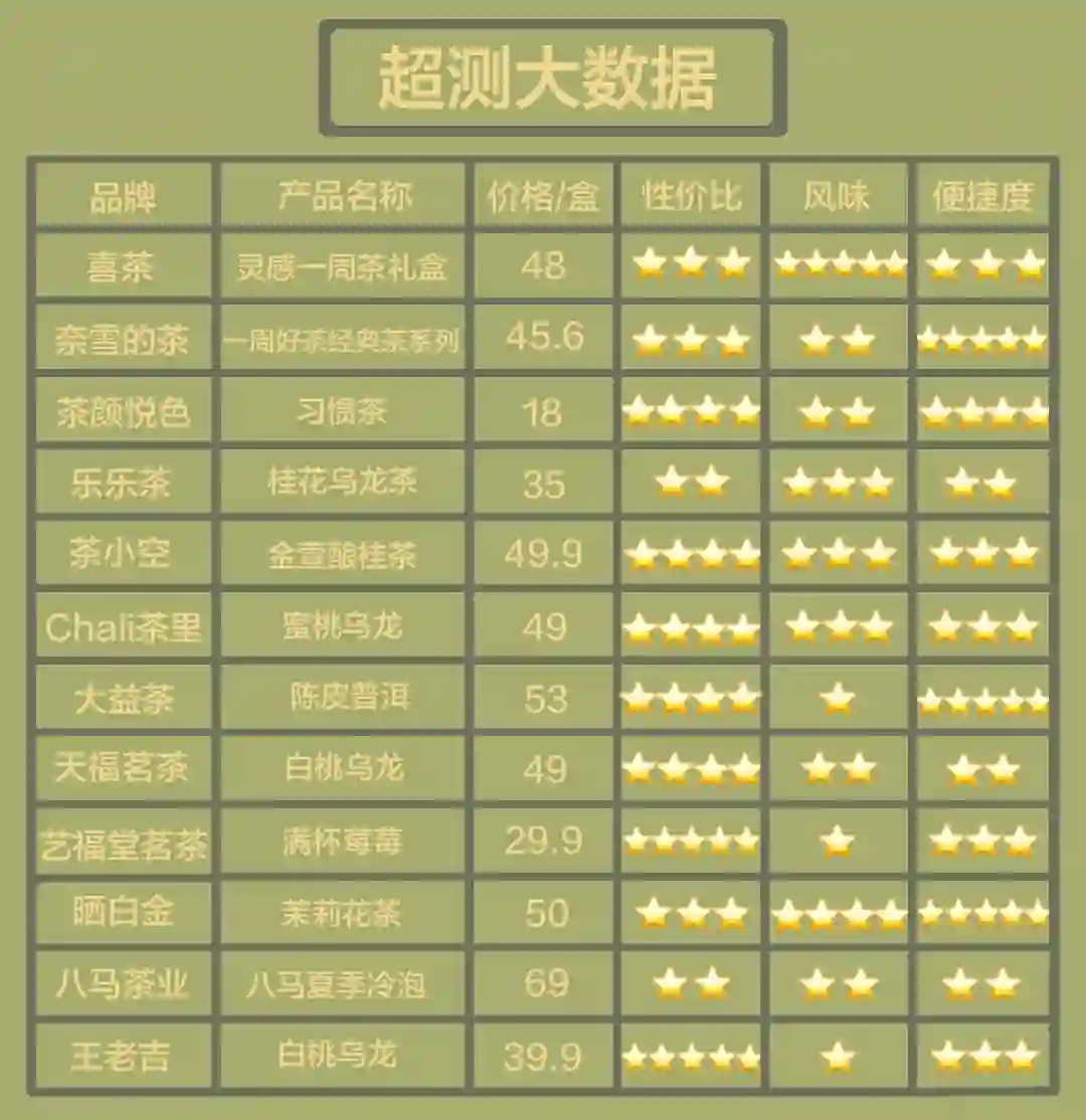 为了给大家更好地拔草,我们从去年天猫双十一销售前10、和新消费热门国产品牌中精选了以下12个国货品牌,分别是风头很大的新消费品牌喜茶、奈雪的茶、茶颜悦色、乐乐茶、茶小空、Chali茶里,以及屹立多年的传统国货老牌大益茶、八马茶业、天福茗茶、艺福堂茗茶、晒白金,甚至还有国民品牌王老吉!