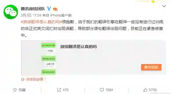 针对此情况,腾讯微信团队官方微博发布声明称:“这是由于我们的翻译引擎在翻译一些没有进行过训练的非正式英文词汇时出现误翻,导致部分语句翻译出现问题,目前正在紧急修复中。”
