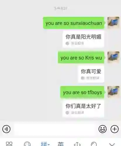 具体来看,当网友输入you are so Kris wu后,得到的翻译结果为你真可爱,而当网友输入you are so tfboys时,得到的结果为你们真是太好了。