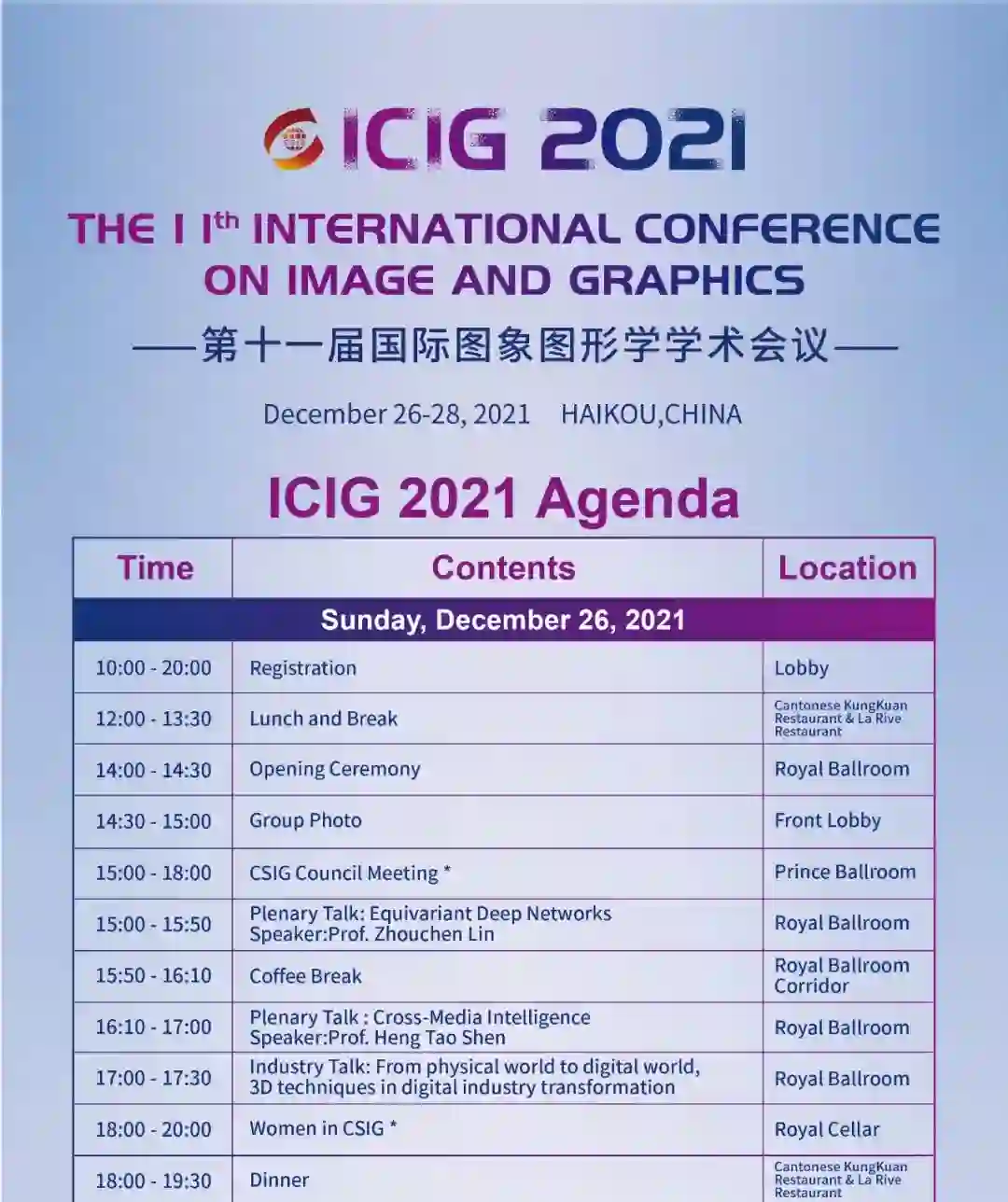 第十一届国际图象图形学学术会议(ICIG 2021)将于2021年12月26-28日在海口举行,会议由中国图象图形学学会主办,海南大学承办,南京理工大学协办。会议聚焦图像、视频及图形处理领域的创新技术,旨在促进创新、创业和交流,诚邀国内外图像图形领域的科技人员参会交流。