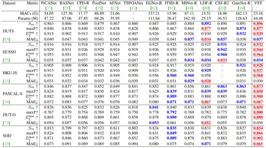 表 1 本文VST和其他12个SOTA RGB 显著性方法在6个数据库上的定量比较