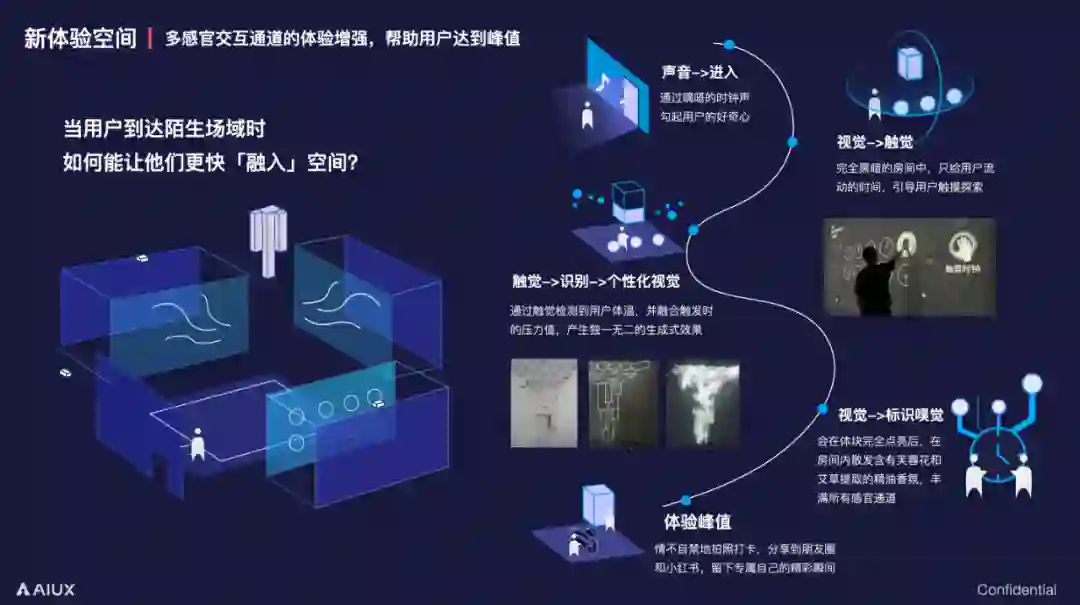 在这里给你分享一个我们 2019 年的空间体验案例。你能看到,当构建一个新的互动装置时,我们是如何逐层地通过感官和用户行为,来构建整个场域的体验设计思考的。
