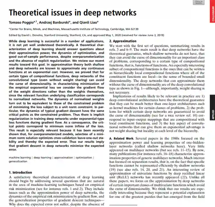 虽然深度学习在许多应用中都取得了成功,但它在理论上还没有得到很好的理解。尽管存在过度参数化和缺乏显式正则化,但深度学习的理论表征应该回答有关其近似能力、优化动力学和强泛化性能的问题。为了实现这一目标,我们回顾了最近的成果。在近似理论中,浅层网络和深层网络都可以以指数代价逼近任意连续函数。但是,我们证明了对于某些类型的合成函数,卷积型深度网络(即使没有权值共享)可以避免维数诅咒。在描述最小化经验指数损失时,我们考虑权值方向的梯度流动,而不是权值本身,因为相关的分类函数对应于归一化网络。归一化权值的动力学结果等价于在单位范数约束下最小化损失的约束问题。特别地,典型梯度下降动力学与约束问题具有相同的临界点。因此,在梯度流中,在指数型损失函数下训练深度网络存在隐式正则化。因此,临界点对应于损失的最小常模infima。这个结果特别相关,因为它最近表明,对于过度参数化的模型,选择最小范数解决方案优化了交叉验证留下一的稳定性,从而优化了预期误差。因此,我们的结果表明梯度下降深度网络的期望误差最小。