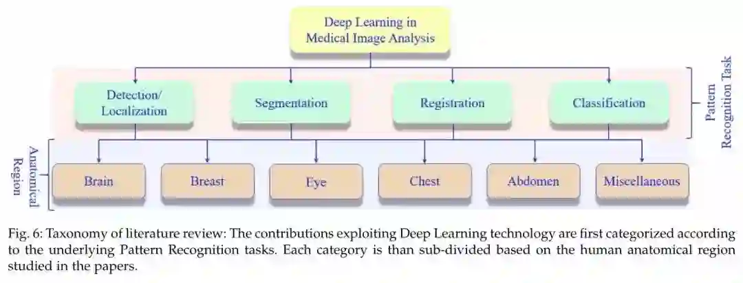 医学图像分析主要包含的模式识别任务是检测/定位、分割、配准、分类。常见的医学影像包括Brain、Breast、Eye、Chest、Abdomen等。