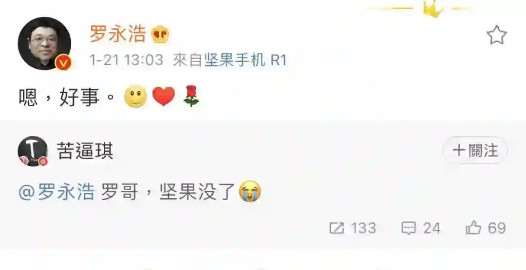 此前字节跳动内部宣布:不再研发坚果手机、TNT 显示器等传承自锤子科技的产品。至此“锤子手机”正式落幕。引发了很多“锤友”的怀念和惋惜。有不少网友在社交媒体发帖表达自己对“锤子手机”的怀念。1 月 21 日,锤子科技创始人罗永浩,在回复一名网友时表示:“嗯,好事。”
