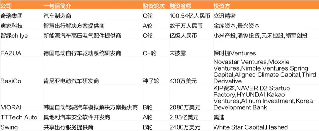 本周全球汽车交通领域融资事件共8起,其中国内3起,国外5起。据睿兽分析不完全统计,本周国内汽车交通融资金额总计超100亿元人民币,海外融资金额总计超3亿美元。