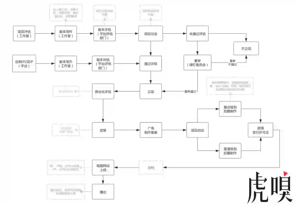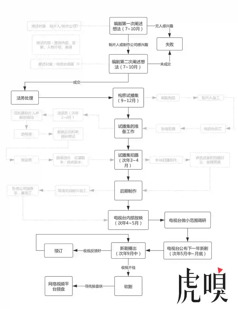 但美剧的流程和管理也只有“参考意义”,爱奇艺、腾讯和优酷的网剧制作流程各有其玩顺手的一套方法论,在采访了多家视频平台与一线制片人员之后,虎嗅总结出了国内视频平台的自制剧、定制剧的通用制作流程——