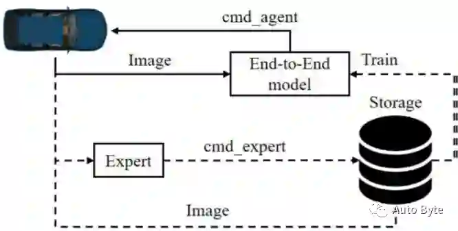 为了避免该问题,研究者采用如图2所示的在线训练方法:由网络控制车辆,同时由专家提供控制命令。训练过程中获取的图像将作为训练数据,而专家给出的命令作为标签,这些数据随后被用来训练网络。