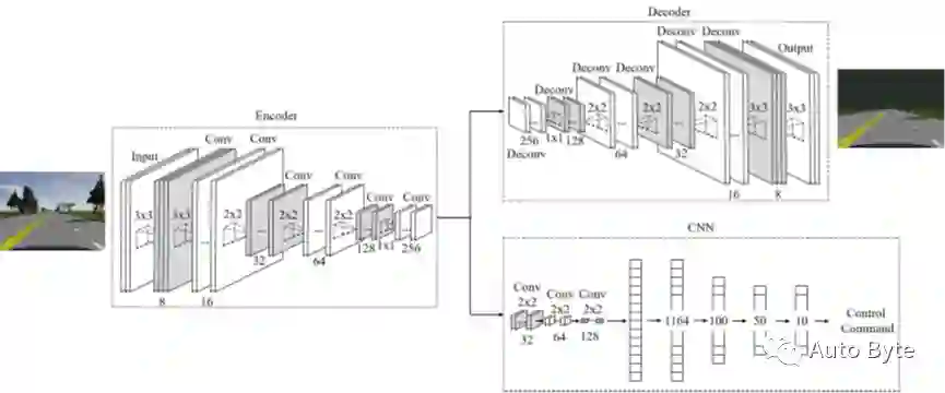 论文作者列出了相应算法的主要思想和基本过程:该系统由自动编码器和自动编码器组成如图1所示。来自前置摄像头的图像作为输入提供给自动编码器。自动编码器由编码器和解码器组成,编码器的输出作为CNN的输入,CNN计算并输出转向角度来控制车辆。