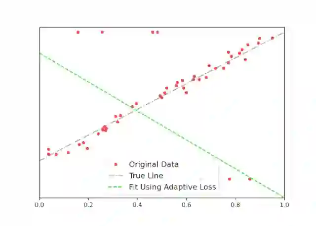 关于鲁棒损失的理论掌握了,怎么实现呢?使用的代码在 Jon Barron 的 GitHub 项目「robust_loss_pytorch」中稍加修改。此外还创建了一个动画来描述随着迭代次数的增加,自适应损失如何找到最佳拟合线。