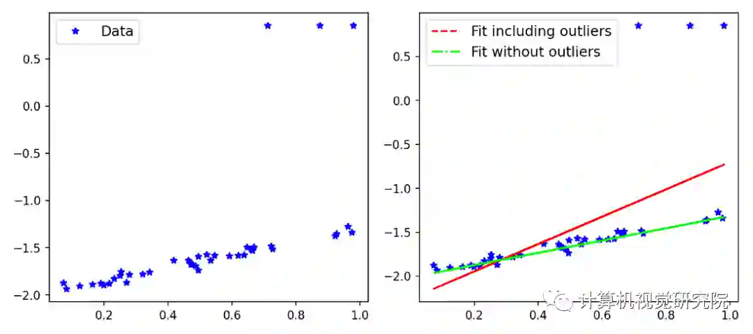 下图为使用Scikit-Learn创建的示例,演示了在有/无异常值影响的情况下,拟合是如何在一个简单数据集中变化的。